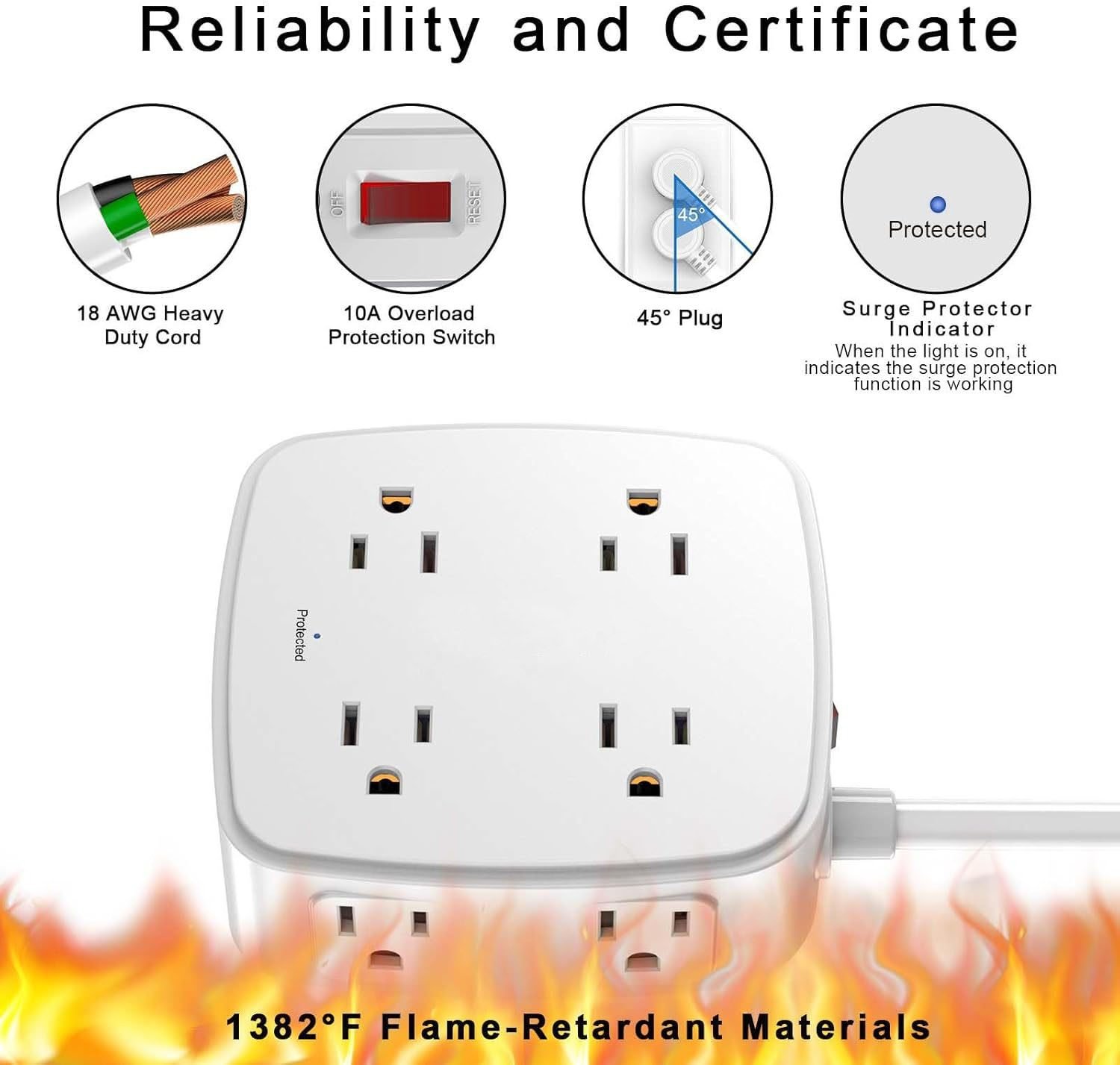 A 45° low-profile flat plug prevents bottom outlet blockage in tight, narrow spaces easily. The 6-foot extension cord offers flexible placement to reach distant wall outlets without strain. Two back mounting holes allow secure wall installation to save counter and floor space effectively. This compact build fits seamlessly in bedrooms, offices, dorms, and living areas universally.