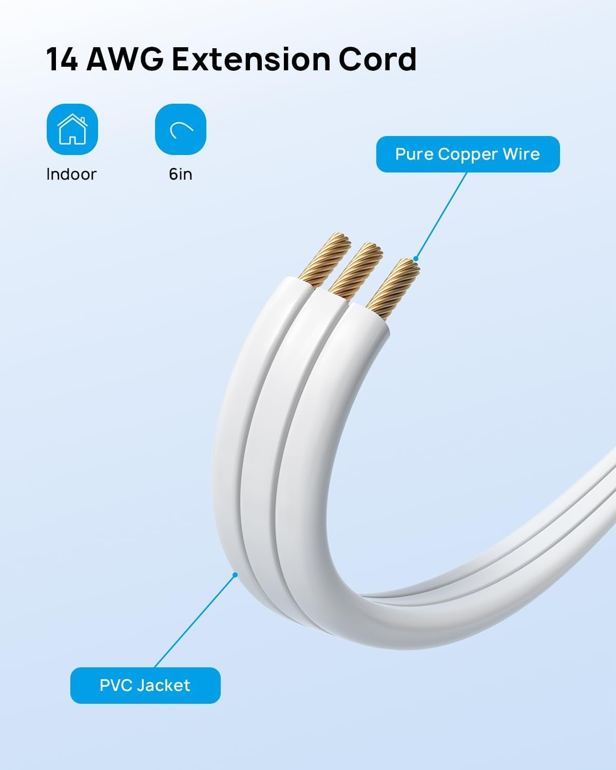 The 6-inch (15.2cm) 14-gauge flat extension cord balances reach and tidiness for versatile positioning. It is long enough to shift the extender sideways or tuck it into tight gaps as needed for use. This short cord avoids tangled wires that come with long extension cables, keeping spaces neat and organized. It powers kitchen gadgets, charges devices, and runs small garage tools reliably every time.