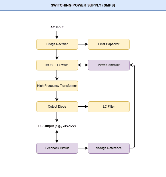 - Output Rectification & Filtering (Stable DC Output): Rectifies and filters again to produce smooth DC output (e.g., 24VDC).
